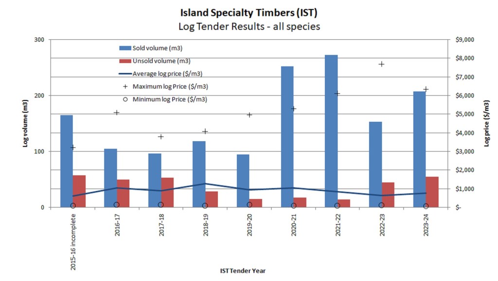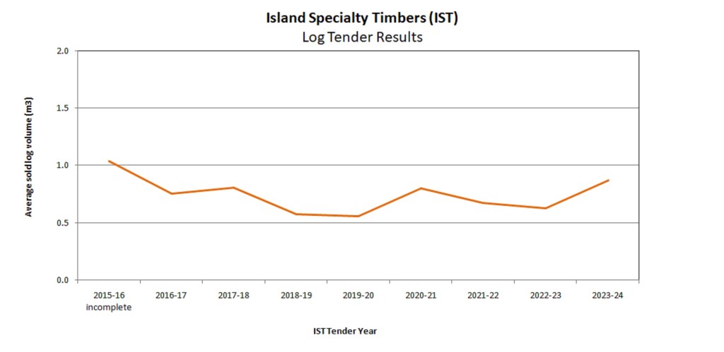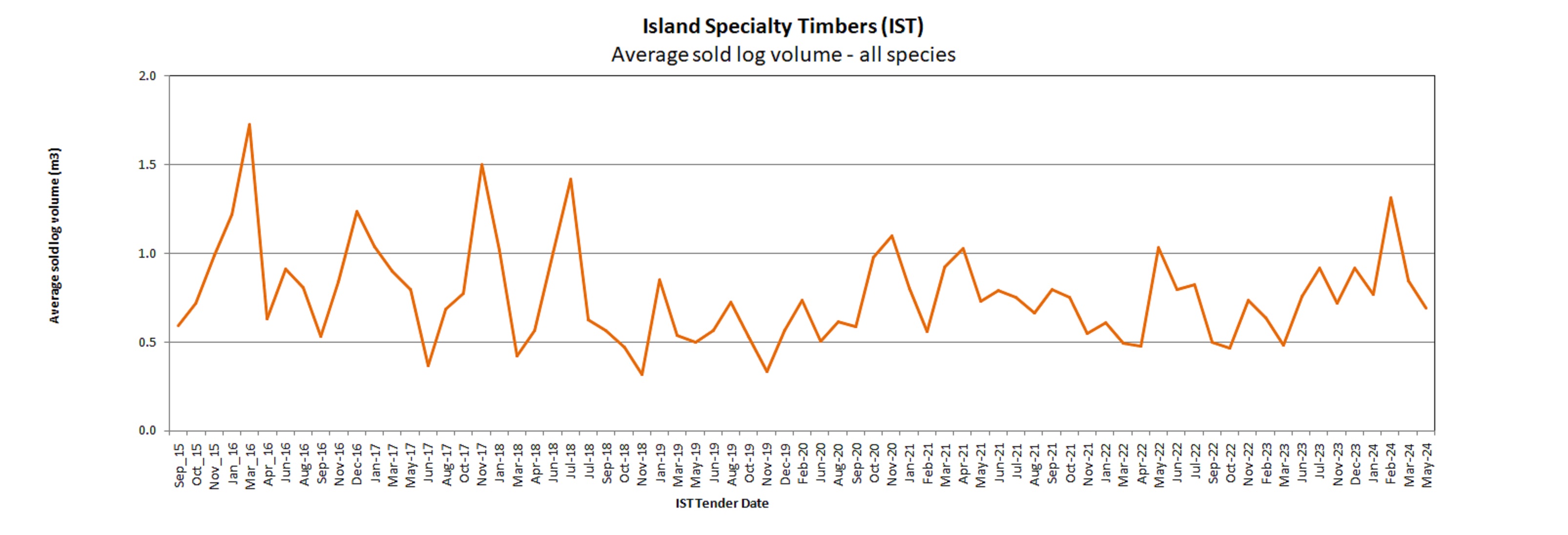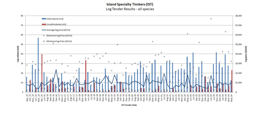The following chart shows the volume and price summary for 65 IST log tenders back to 2015. That is over 1800 cubic metres of tendered log and craftwood.