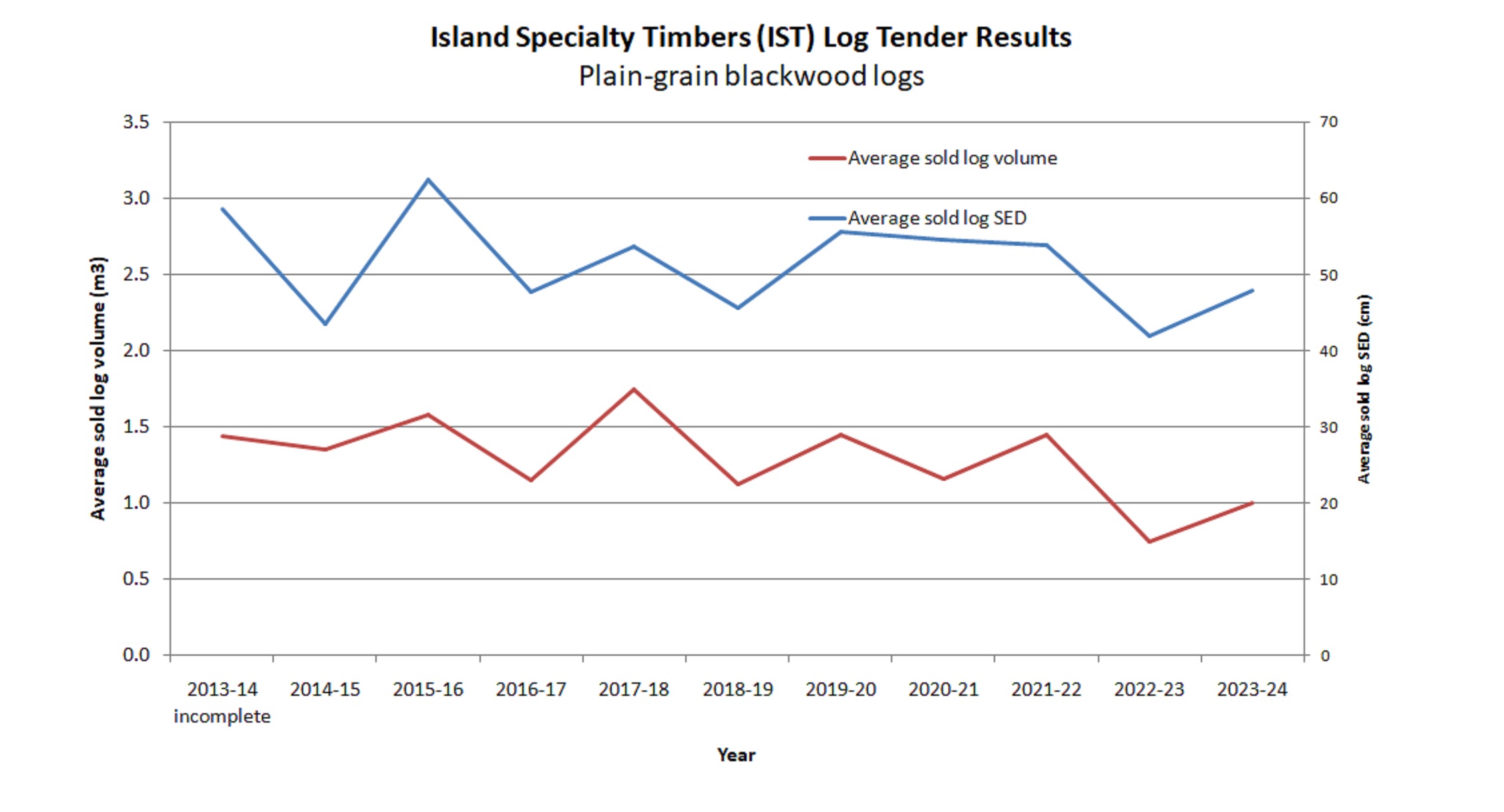IST put a mere 20 blackwood logs to tender totalling 21.7 cubic metres in 2023-24. Only one log had feature grain, all the rest being straight plain grain logs. Six logs (including the feature grain log) totalling 7.7 cubic metres failed to sell at tender. For the 14.0 cubic metres of sold plain grain logs, prices ranged from $250 to $925 per cubic metre with an average price of $454 per cubic metre.