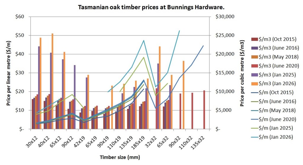 It’s been five years since I checked the prices of conflict-driven, welfare-dependent Tasmanian oak timber at Bunnings Hardware, Australia’s largest timber retailer. Given my previous post about timber prices after the shutdown of welfare forestry in West Australia and Victoria, I thought I should do an update.