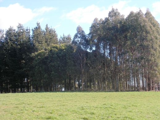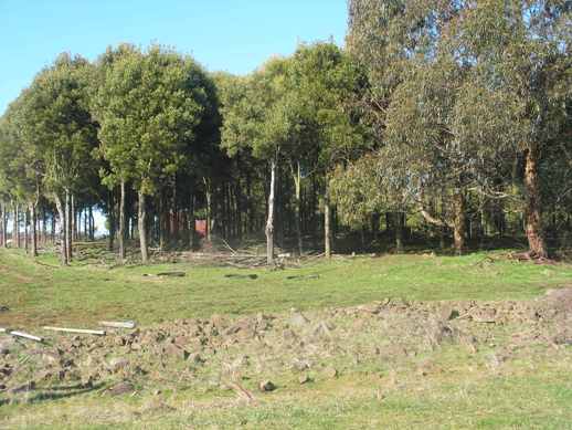 There are 4 block plantings of 15 year-old pure blackwood. Until acquired by the current owner, none of these had received any thinning or pruning. Three of these plantings are on a stony ridge top with shallow soils. The result is that these blackwoods are all short, of poor form, and in the worst case have dead tops and are infested with wattle grub (a clear indication the trees have been under drought stress). These three areas are now providing useful stock shelter but have no commercial wood production potential.
