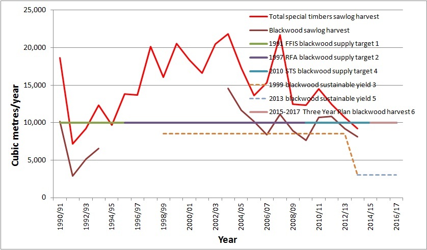 The chart is of limited value as it does not show special timbers production in relation to either sustainable yield, or the RFA/STMS supply target. Therefore in order to improve public understanding and debate I have added the new historical data (including estimating blackwood production by measuring directly off the chart) to my chart of special timbers mismanagement (note the 9 years of missing blackwood production data). If anyone can see in this chart the relationship between planned versus sustainable versus actual production they clearly have a better imagination than I.