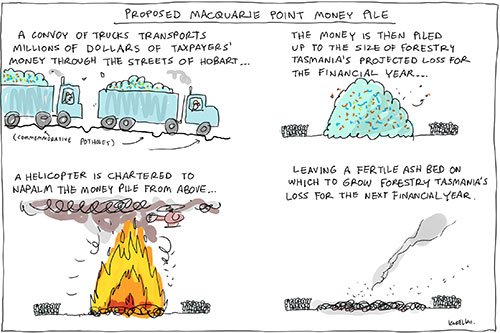 As Mr. Kudelka clearly illustrates with his cartoon, the folly around State forest policy and practice continues unabated, and the burning of precious taxpayers money will likely continue for many years to come.