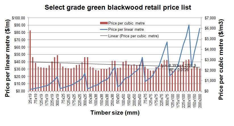 Not only is this blackwood incredibly cheap (cheaper than Radiata pine), but the blackwood grower is actually being punished for growing large trees. I’ve added a linear trendline to the cubic metre price data to show how the cubic metre price drops as the timber size increases.