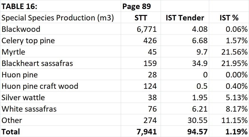 The following table shows the data from the STT annual report (page 89) summarising the annual sale of specialty timbers from the plunder of our public native forests; together with my own summary of Island Specialty Timbers (IST) annual log tender results: