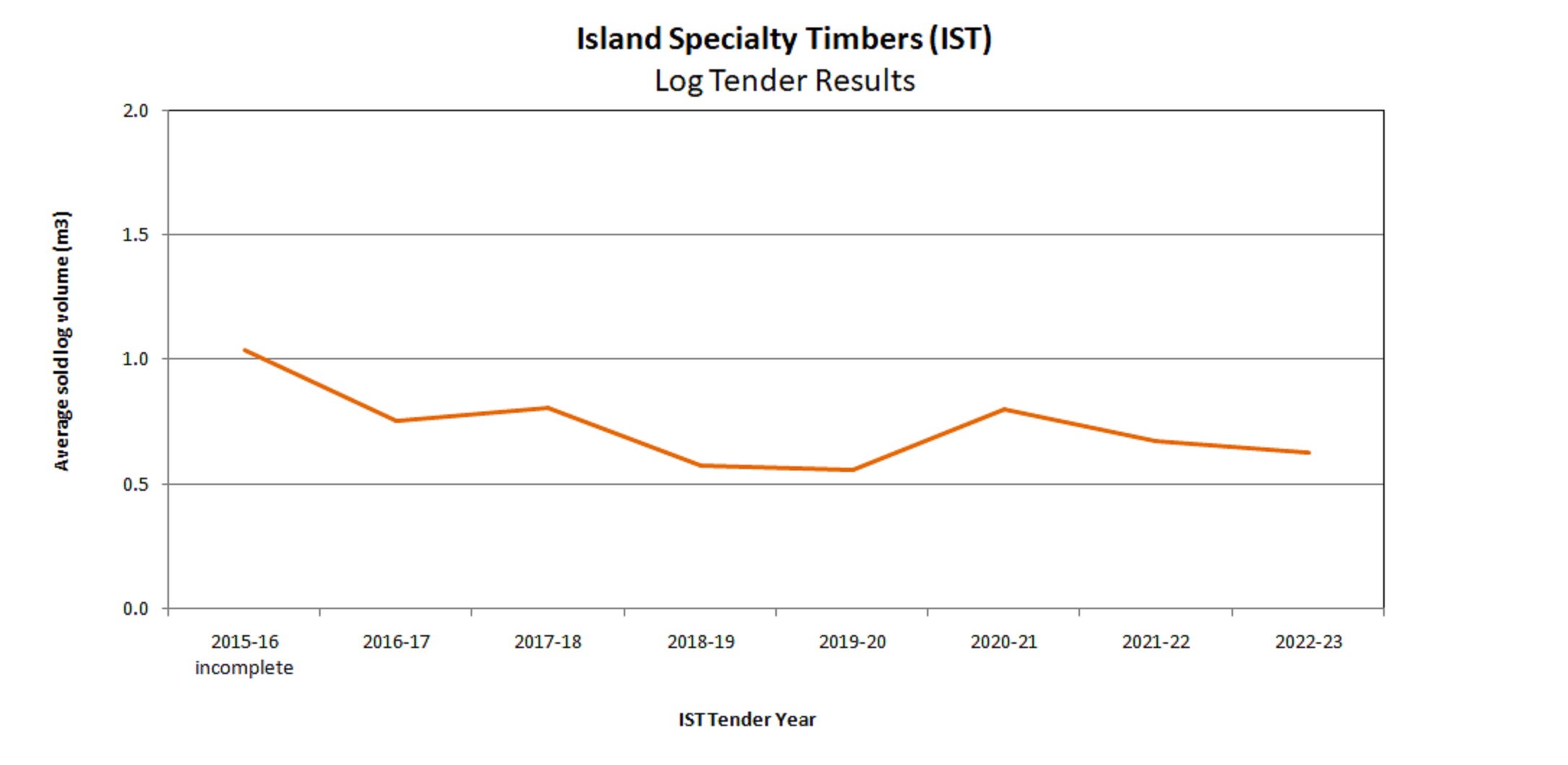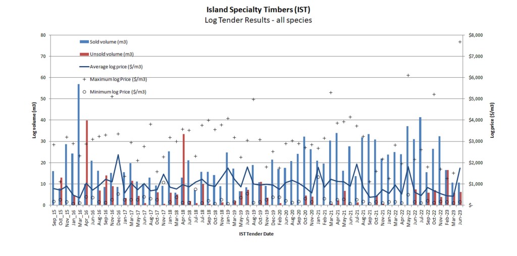 The tiny volumes and wide variability in species and quality of logs that IST put to tender makes assessing market trends over time difficult.