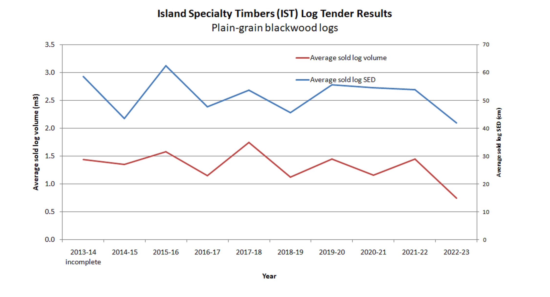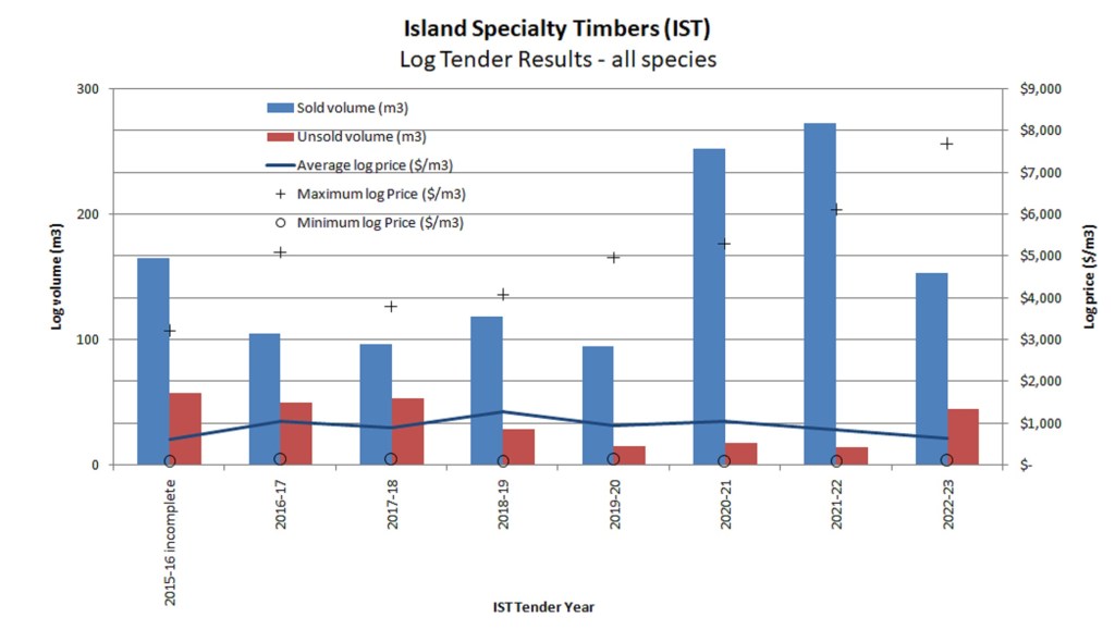 IST put a mere 16 plain grain blackwood logs to tender totalling 11.5 cubic metres. Three logs totalling 1.8 cubic metres were unsold at tender. Prices ranged from $150 to $800 per cubic metre with an average price of $518.