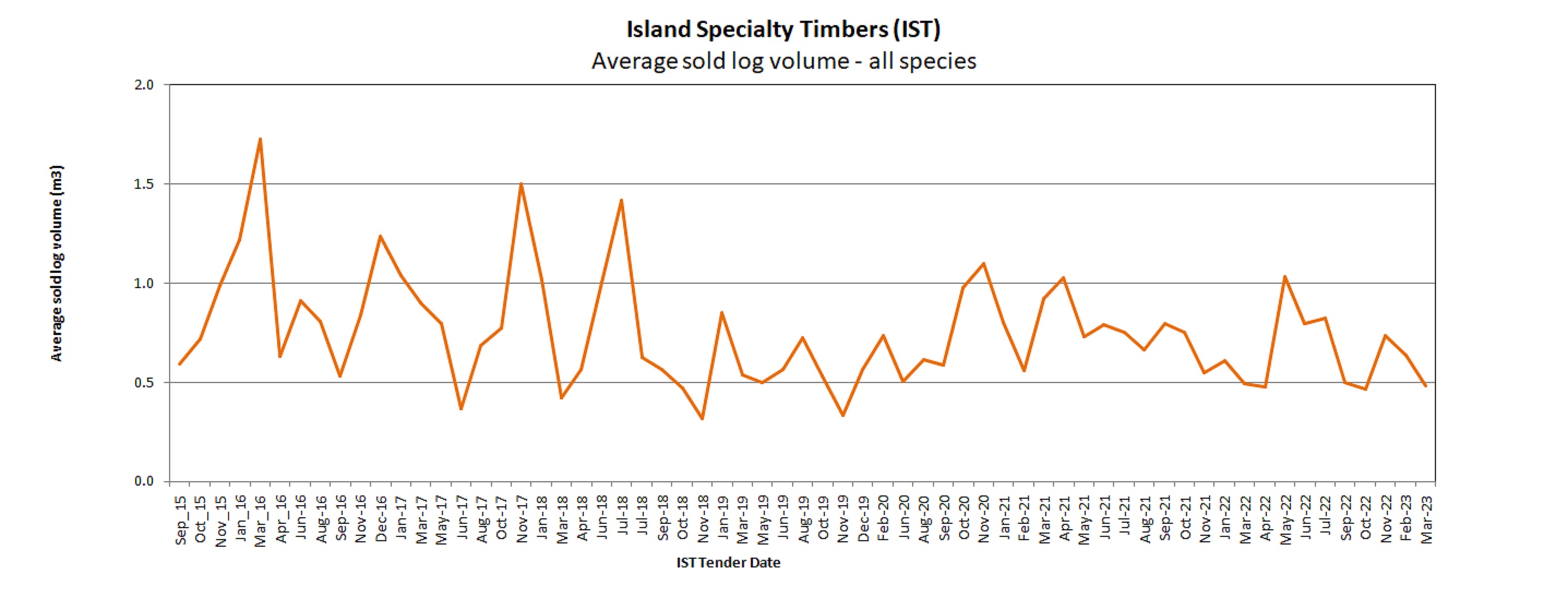 Apart from the June 2023 tender that contained a large volume of Huon pine material, 2022-23 continued the trend from last year of declining average prices.