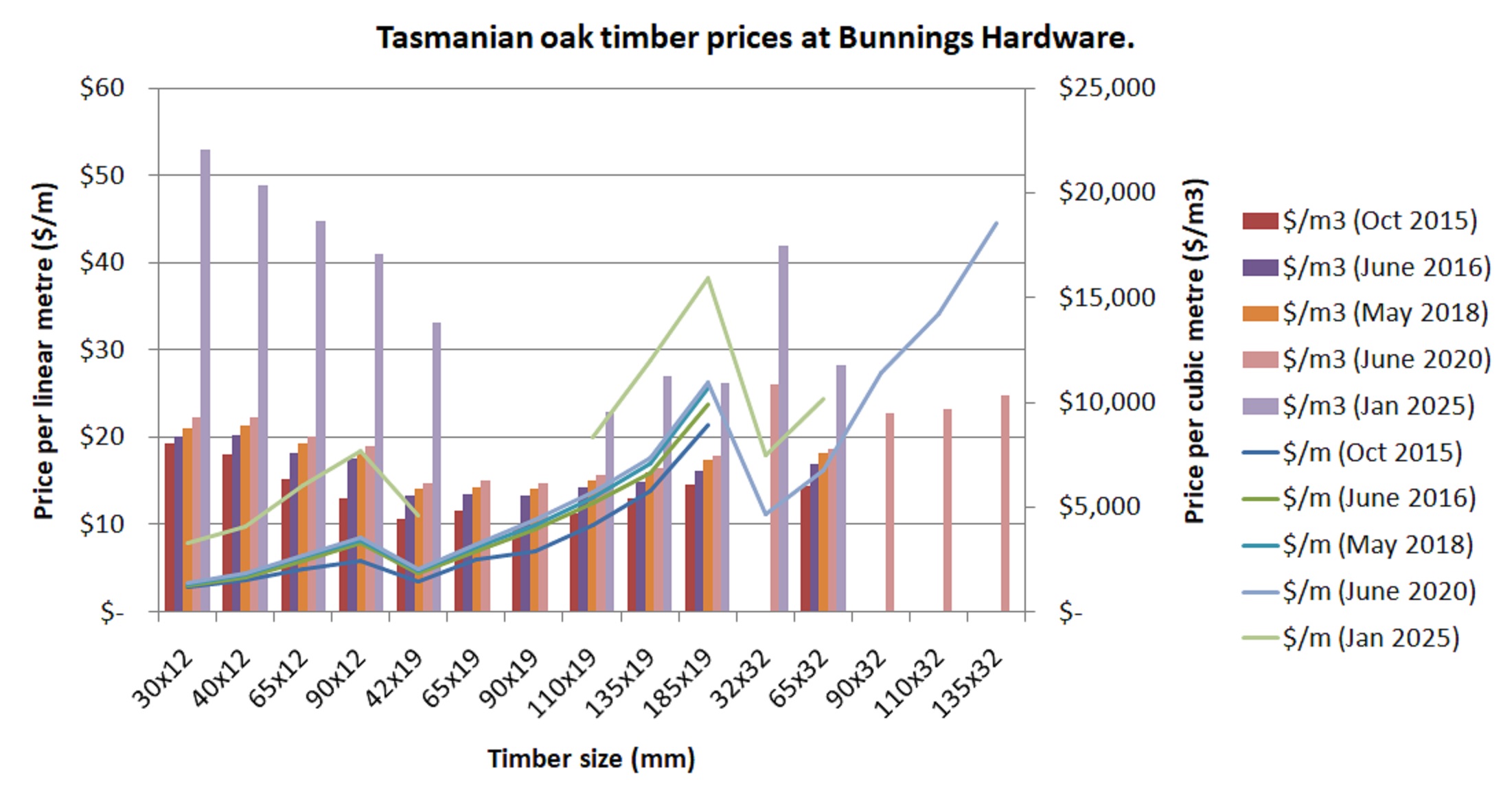 It’s been five years since I checked the prices of conflict-driven, welfare-dependent Tasmanian oak timber at Bunnings Hardware, Australia’s largest timber retailer. Given my previous post about timber prices after the shutdown of welfare forestry in West Australia and Victoria, I thought I should do an update.