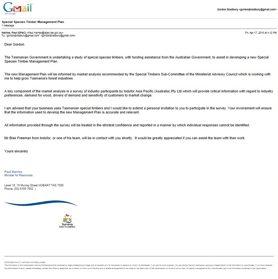 In other words special timbers management in Tasmania is in chaos! Forestry Tasmania is scaling down its special timbers commitments in line with its diminished capacity to supply. And a Special Species Management Plan won’t be available until the next Tasmanian State election in 2017!